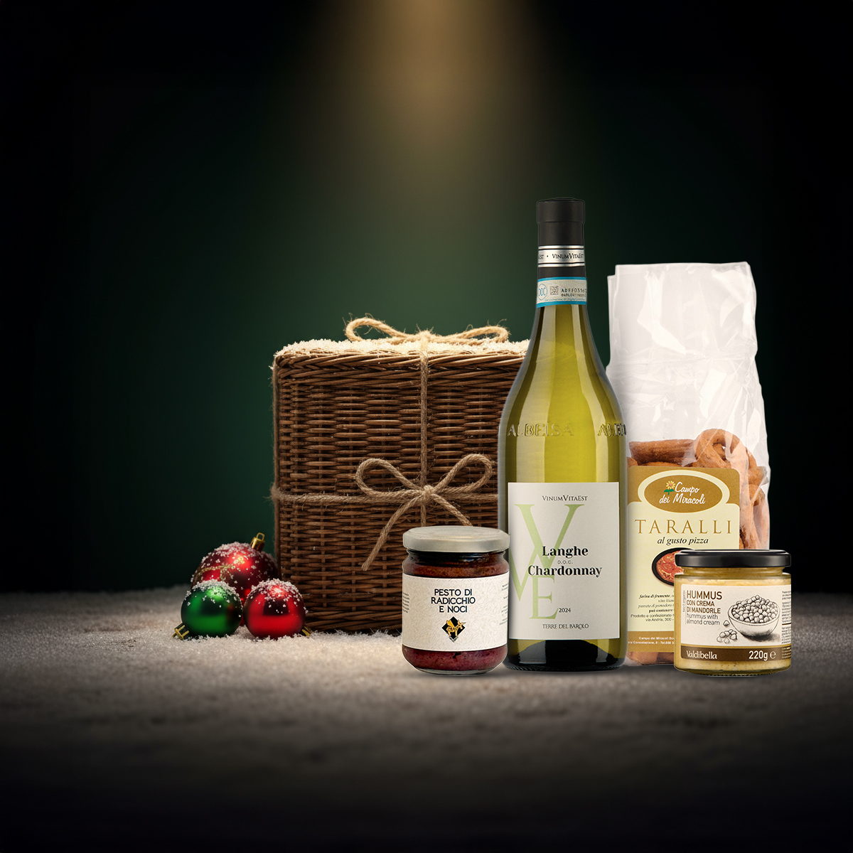 Regala un Apericena Solidale: uno scrigno che rappresenta l'aperitivo ideale per le feste, uno scrigno di sapore e impegno sociale. Ti proponiamo di brindare al territorio italiano con il Langhe DOC Chardonnay Terre del Barolo, e goderti un'aperitivo unico con Taralli Artigianali pugliesi, Hummus con Crema di Mandorle siciliane ed il Pesto Radicchio e Noci dal cuore del Lazio. Prodotta da cooperative che credono nell’etica e nella sostenibilità, questa selezione è il simbolo dell’aperitivo genuino e consapevole.