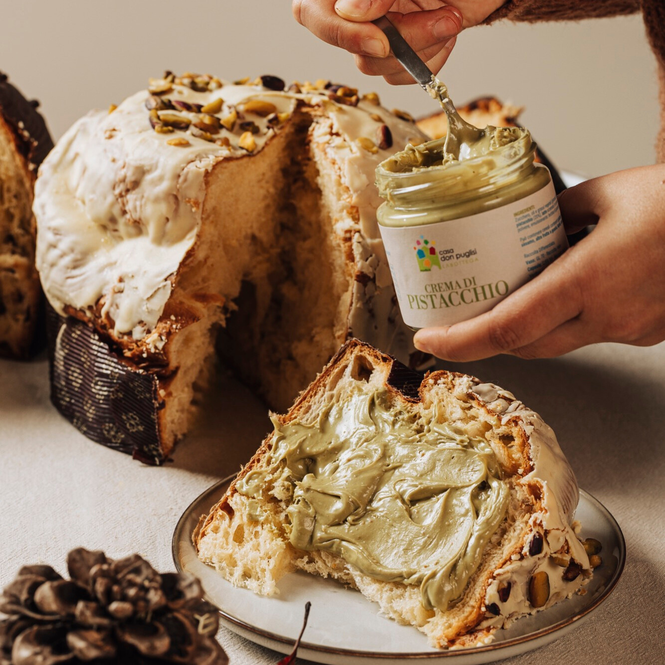 Fai un gesto di gusto e solidarietà con il Panettone Artigianale Con Crema al Pistacchio, genuino e sostenibile!