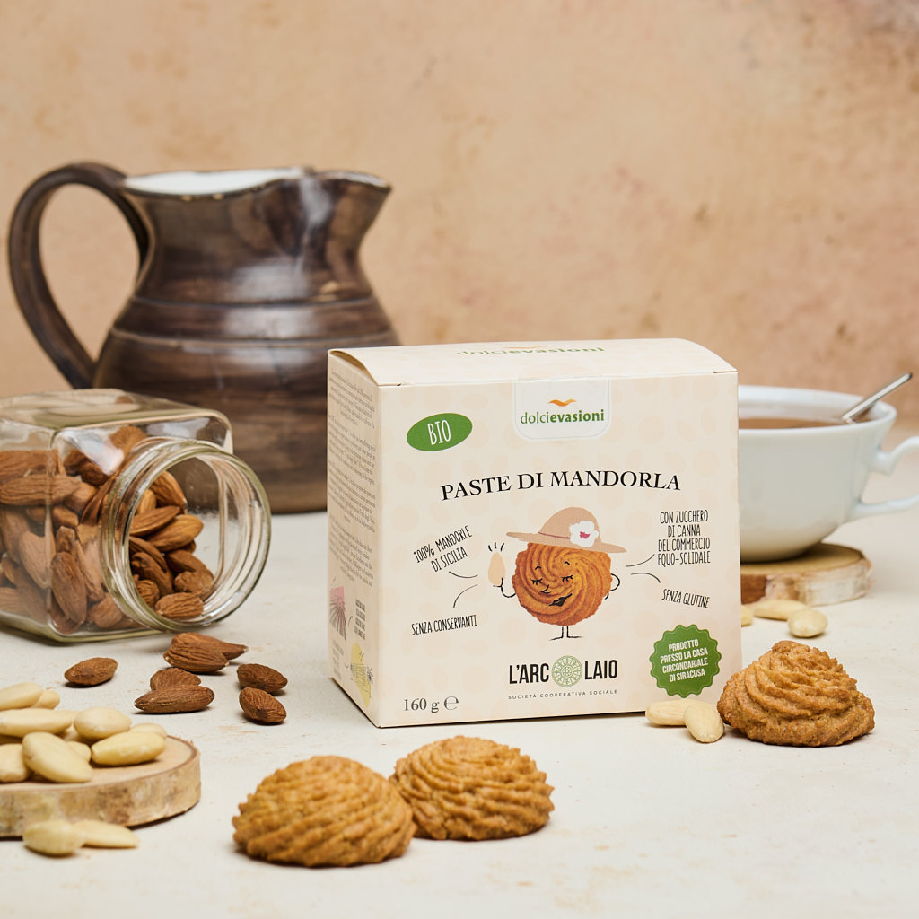 Le Paste di Mandorla Bio sono dolcetti tradizionali siciliani, morbidi e profumati, preparati secondo antiche ricette che esaltano la qualità delle mandorle locali. La cooperativa sociale L’Arcolaio, che le produce all’interno della Casa Circondariale di Siracusa, seleziona mandorle biologiche di Sicilia e ingredienti del commercio equo-solidale per offrire un prodotto genuino e dal forte valore etico. La presenza di zucca candita e miele dona una dolcezza naturale e una consistenza avvolgente, mentre l’aroma di mandorla amara e la buccia di limone aggiungono un tocco aromatico inconfondibile. Questi dolci non sono solo buoni: raccontano una storia di riscatto, inclusione e rispetto per la terra.