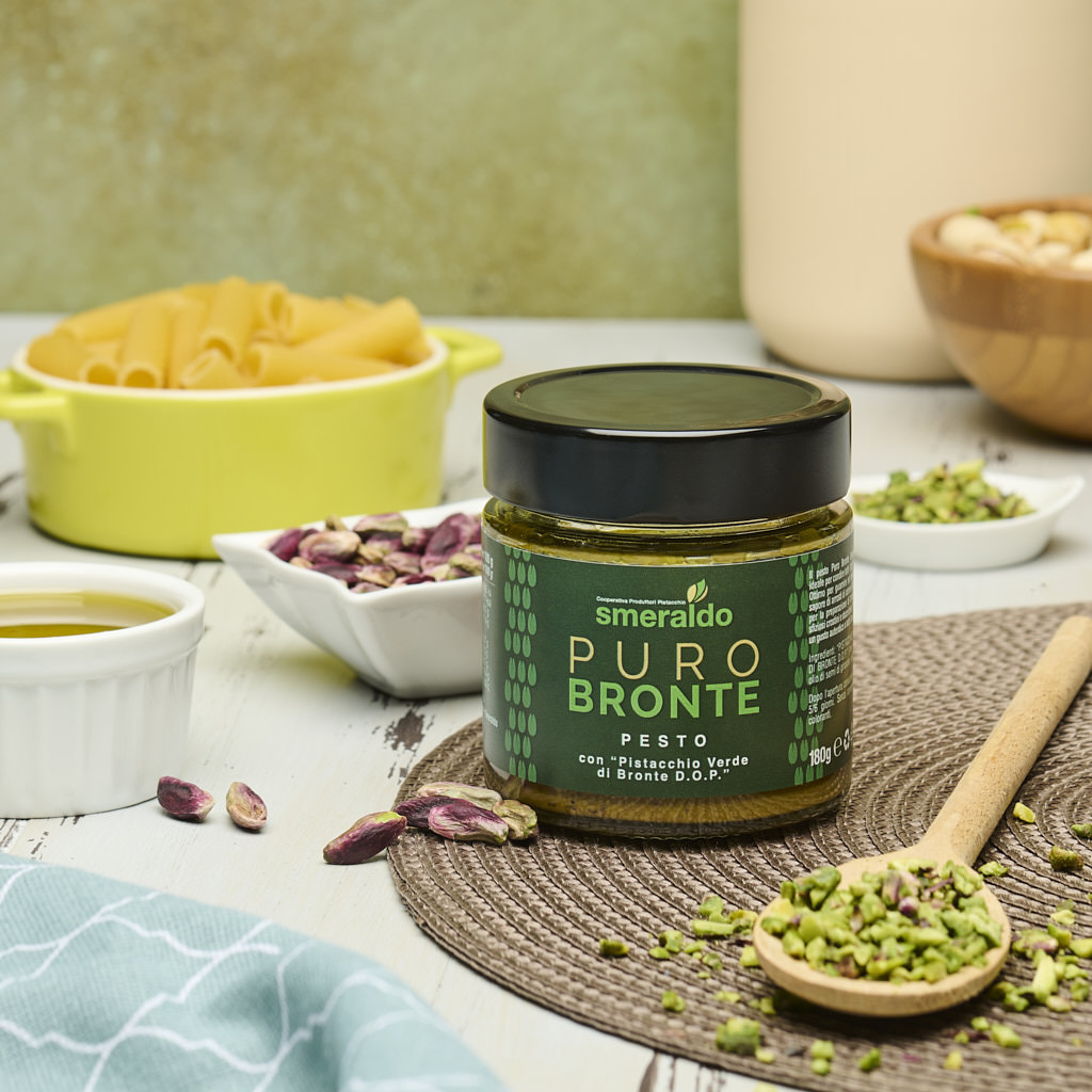 Il Pesto di Pistacchio Verde di Bronte DOP è una delizia siciliana dal gusto intenso e avvolgente. Realizzato con almeno il 70% di pistacchio DOP, questo condimento nasce dalla passione della Cooperativa Smeraldo di Bronte per la qualità e la tradizione. La lavorazione artigianale esalta il sapore autentico del pistacchio, rendendolo protagonista in cucina. Il Pistacchio Verde di Bronte DOP si distingue per il suo colore verde smeraldo, il sapore dolce e aromatico, e la consistenza cremosa che lo rende unico al mondo. Perfetto per realizzare piatti della tradizione siciliana, condire paste e crostini dal gusto della Sicilia autentica.