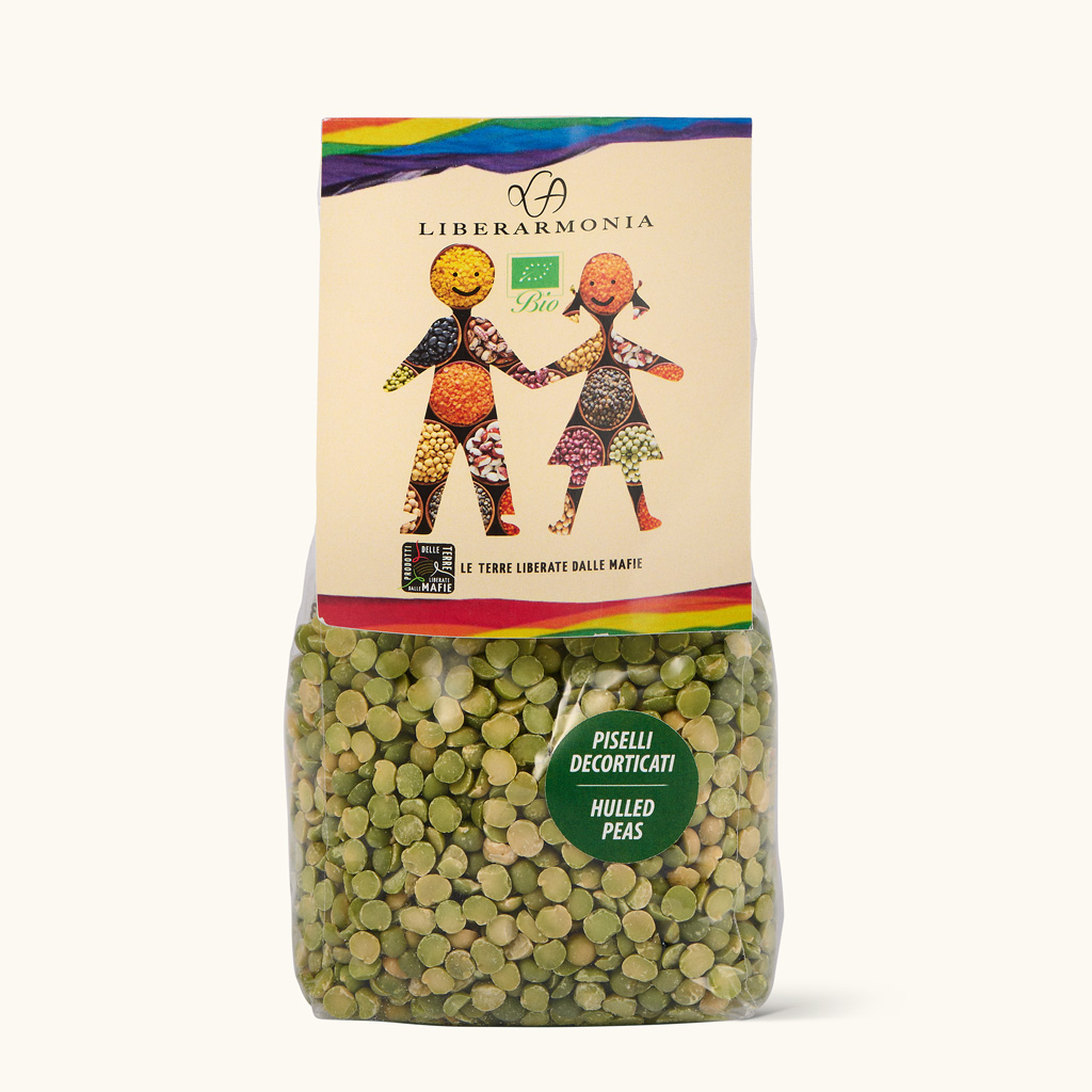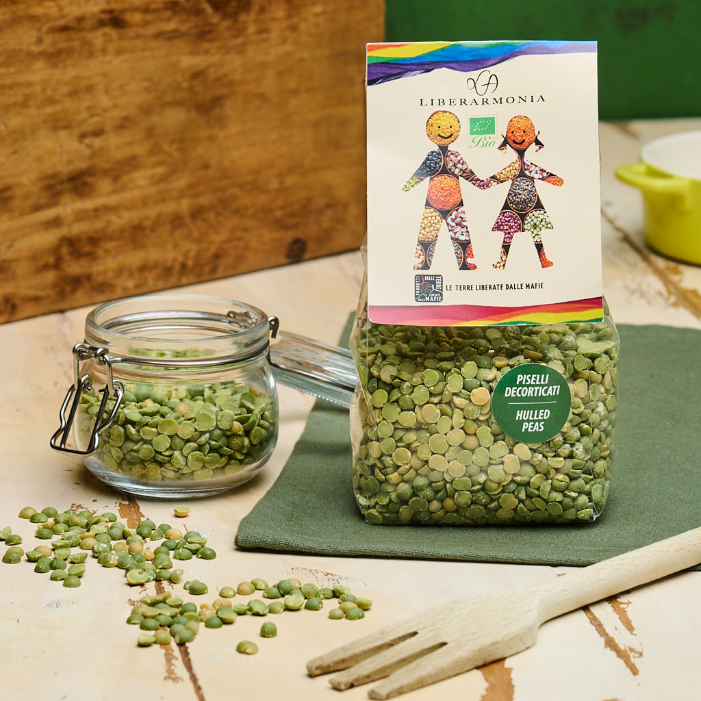 Piselli decorticati biologici coltivati su terre confiscate alla mafia. Leggeri, digeribili e ricchi di vitamine, cuociono rapidamente. Un alimento sano, versatile ed etico, che unisce gusto e impegno sociale.