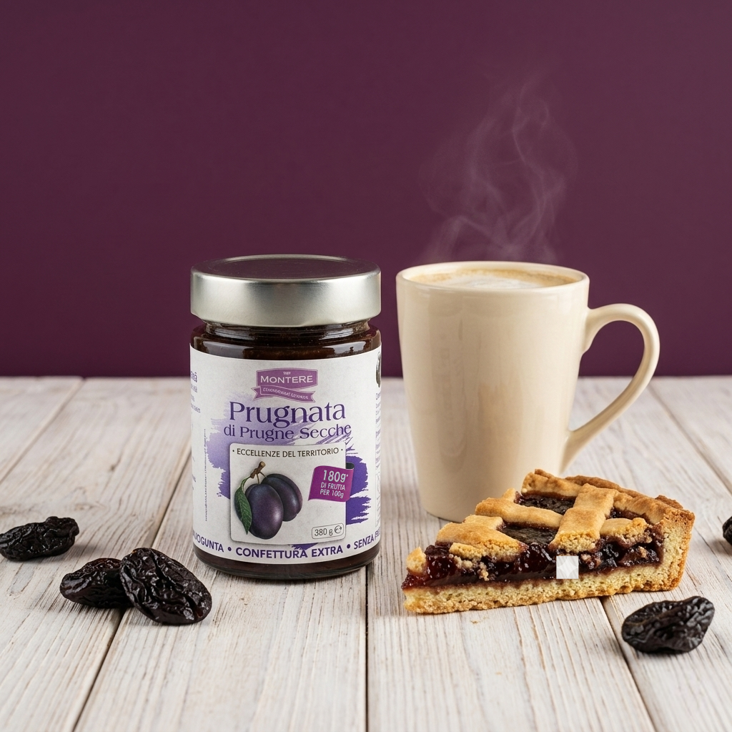 Prodotta dalla cooperativa Monterè, esprime un modello attento alla qualità, alla filiera trasparente e alla tutela della biodiversità, con un forte legame con le produzioni locali italiane. La ricetta prevede una concentrazione elevata di frutta — 180 grammi di prugne per 100 grammi di confettura — che garantisce struttura, gusto pieno e naturale dolcezza. Dal punto di vista sensoriale si distingue per l’aspetto luminoso e leggermente ruvido, dovuto alla presenza di pezzi di frutta, il colore scuro/bruno e una consistenza cremosa.
