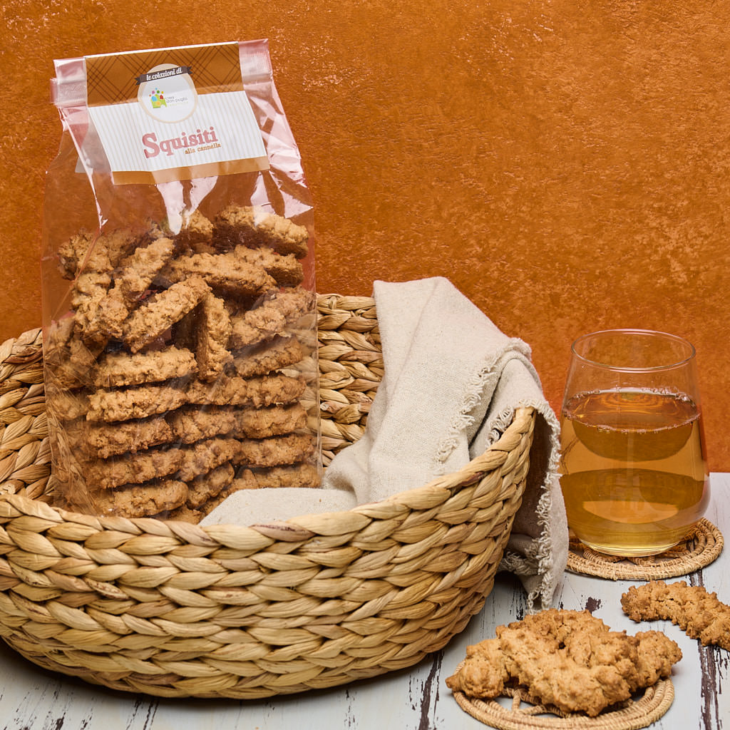 I Squisiti alla Cannella di Casa Don Puglisi sono biscotti fragranti e aromatici, che racchiudono il profumo avvolgente della cannella in una ricetta tradizionale siciliana. Preparati nel laboratorio artigianale della cooperativa sociale a Modica, questi biscotti combinano farine locali con ingredienti semplici e naturali, per offrire un gusto caldo e speziato, ideale per accompagnare momenti di relax. Ogni biscotto è il frutto di un lavoro che unisce passione, qualità e un forte valore umano.