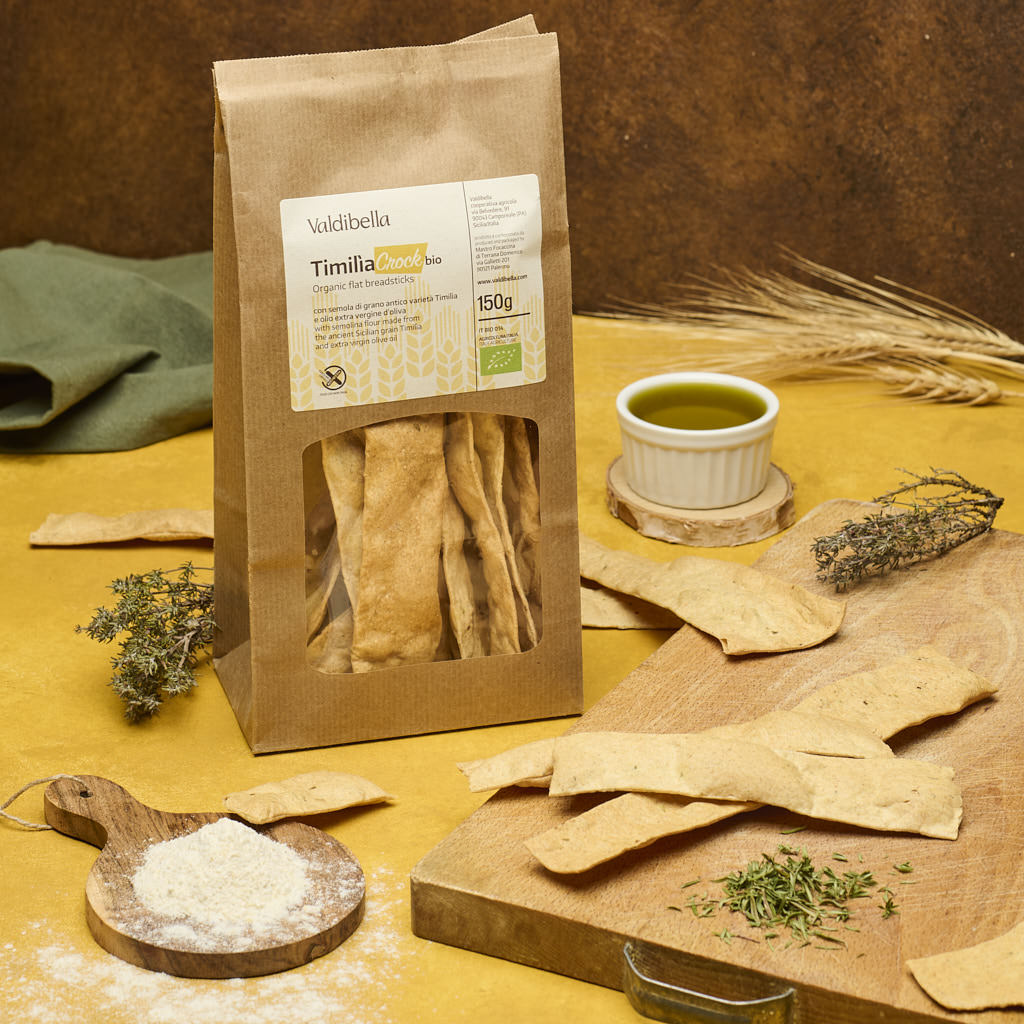 Croccanti, aromatici e genuini, i Timilìa Crock sono snack da forno realizzati con semola integrale di grano duro Timilìa, una varietà antica siciliana coltivata secondo metodi biologici. La loro forma irregolare e allungata, unita all’aroma naturale di origano e timo, li rende irresistibili e perfetti per ogni momento della giornata. Prodotti artigianalmente dalla Cooperativa Agricola Valdibella, attiva in Sicilia con progetti di inclusione sociale, questi snack sono privi di conservanti e additivi, ricchi di vitamina E e altamente digeribili.
