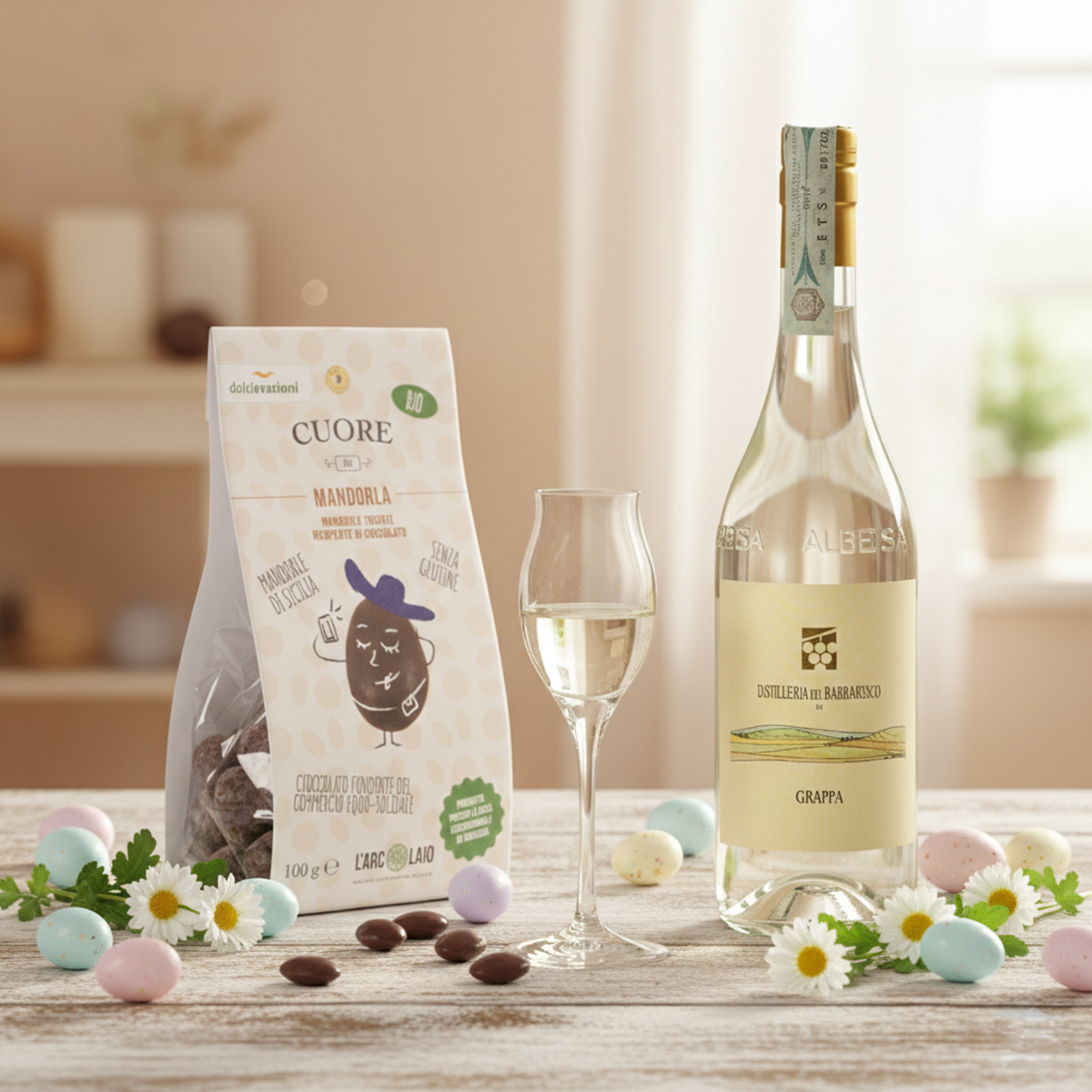 Un’idea regalo che unisce sapori autentici, artigianalità e impegno sociale. Una box pasquale realizzata con prodotti di cooperative che valorizzano il territorio e promuovono progetti di inclusione, trasformando un semplice dono in un gesto concreto. Pensata per le festività ma perfetta da gustare tutto l’anno, la box contiene due eccellenze italiane: Cuore di Mandorle Tostate ricoperte di Cioccolato Bio selezionate, croccanti e avvolte da finissimo cioccolato bio, e una Grappa di Barbaresco, elegante, espressione autentica delle Langhe.