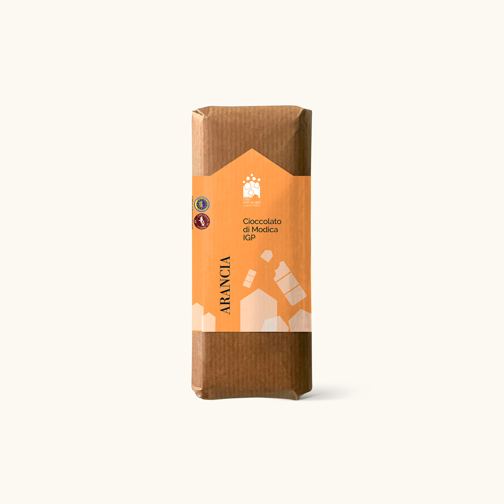 Il Cioccolato di Modica IGP all'Arancia è una raffinata interpretazione della tradizione siciliana, dove il gusto intenso del cacao incontra la vivacità agrumata dell’arancia. Prodotto artigianalmente dalla Cooperativa sociale Casa Don Puglisi, questo cioccolato nasce in un laboratorio che offre lavoro e dignità a donne con passati di violenza. La scorza d’arancia essiccata e l’aroma naturale conferiscono al prodotto un profumo fresco e un sapore equilibrato. Questo cioccolato è realizzato secondo l’antico metodo modicano, che prevede la lavorazione a freddo della pasta di cacao.