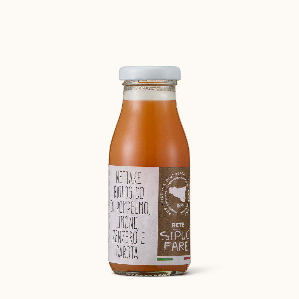 Il Nettare Biologico di Pompelmo, Limone, Carota e Zenzero nasce in Sicilia da frutta accuratamente selezionata e raccolta al giusto grado di maturazione. Prodotto artigianalmente da Si Può Fare Società Agricola Cooperativa Sociale Onlus, unisce freschezza, leggerezza e benessere in un mix unico dal sapore intenso e naturale. Realizzato solo con ingredienti biologici, senza conservanti, additivi o aromi artificiali, regala un’esplosione di gusto che racconta la vera essenza del Mediterraneo.