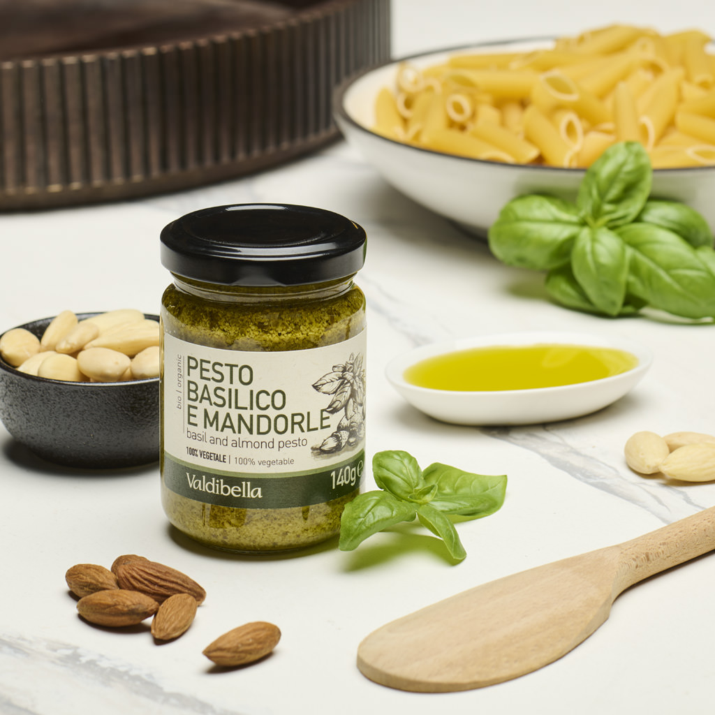 Il Pesto di Basilico e Mandorle Bio Valdibella è una reinterpretazione siciliana del classico pesto. Realizzato con foglie fresche di basilico, raccolte nel pieno della stagione estiva, e mandorle siciliane tostate che donano croccantezza e intensità aromatica, questo condimento è completato da olio extravergine d’oliva proveniente da cultivar locali (Cerasuola, Biancolilla e Nocellara). La sua ricetta semplice e genuina riflette la filosofia della Cooperativa Agricola Valdibella: rispetto per la terra, inclusione sociale e valorizzazione delle risorse locali.