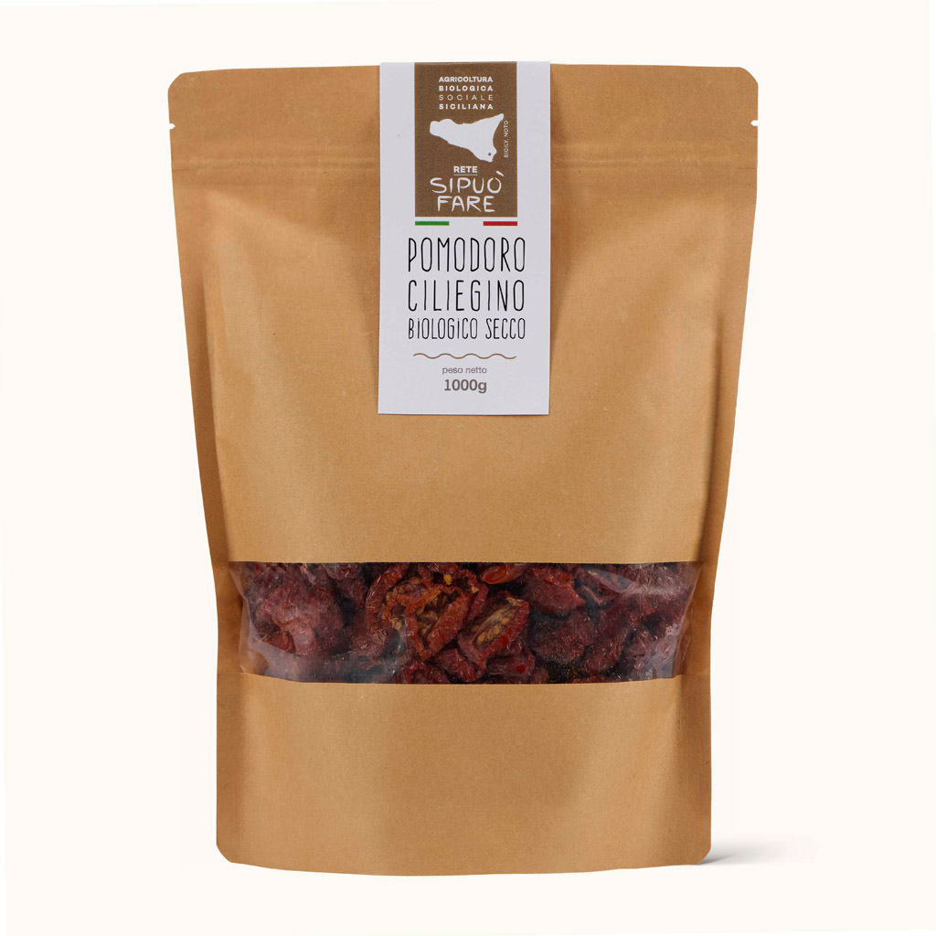 Dal cuore della Sicilia, questi pomodori ciliegino secchi biologici vengono raccolti a mano e cosparsi di sale grosso per favorire una naturale perdita di liquidi. Successivamente, vengono essiccati e confezionati sottovuoto per preservarne gusto, morbidezza e qualità. Prodotto artigianalmente da Si Può Fare Società Agricola Cooperativa Sociale Onlus, è frutto di una filiera sostenibile che valorizza il territorio e utilizza solo ingredienti semplici e naturali, senza conservanti.